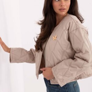 Damska kurtka pikowana o eleganckim charakterze, idealna jako przejściowe okrycie wierzchnie na sezon jesień?zima?wiosna. Wykonana z poliestru, wyróżnia się urozmaiconą fakturą materiału oraz subtelnym pikowaniem, które nadaje całości wyjątkowego wyglądu. Model bez kołnierza prezentuje się nowocześnie i lekko, co czyni go świetnym wyborem zarówno do codziennych stylizacji, jak i do pracy. Kurtka nie posiada zapięcia, dzięki czemu układa się swobodnie i wygodnie. Dodatkowym atutem jest broszka w kształcie motyla, która pełni funkcję eleganckiej ozdoby i dodaje kobiecego akcentu. To lekka, nieocieplana kurtka, która sprawdzi się jako stylowe uzupełnienie wiosennych i jesiennych zestawów, łącząc wygodę z ponadczasową elegancją.